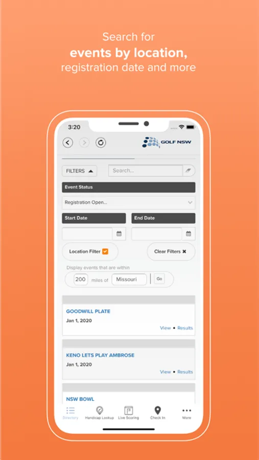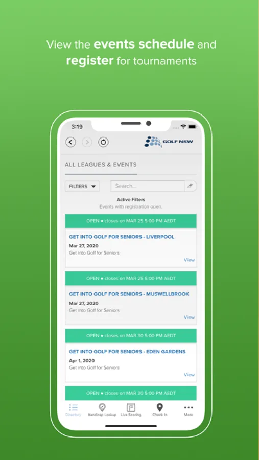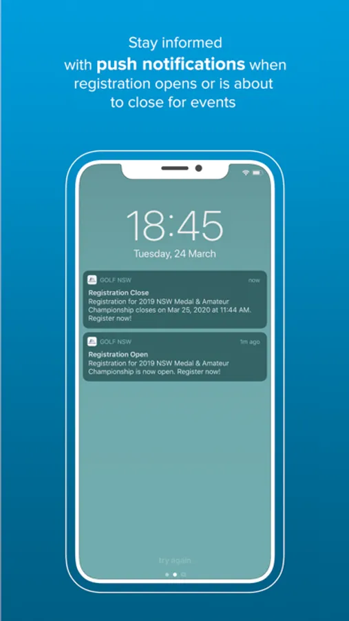 - Push notifications alert golfers when registration opens or is about to close for events.