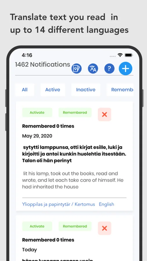 Import ebooks into the app and quickly translate the text you read into many different languages at the same time or create cards so you can remember important points
