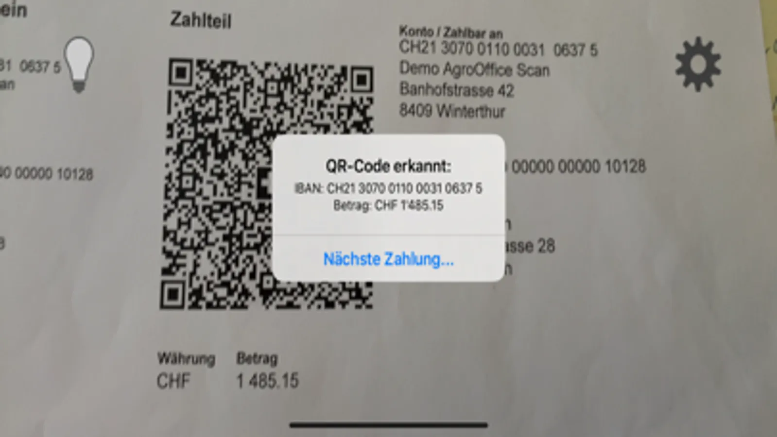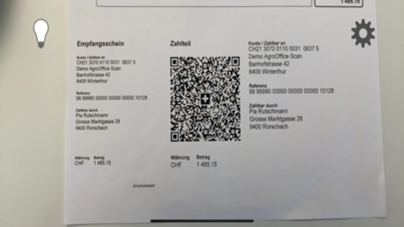Da die App über einen Webservice kommuniziert, ist das Einrichten im Nu erledigt. Einfach QR-Code im EBanking-Modul von AgroOffice mit dem Smartphone abscannen, einen Alias-Namen vergeben und schon kann mit dem Einscannen der eingegangen Rechnungen begonnen werden.