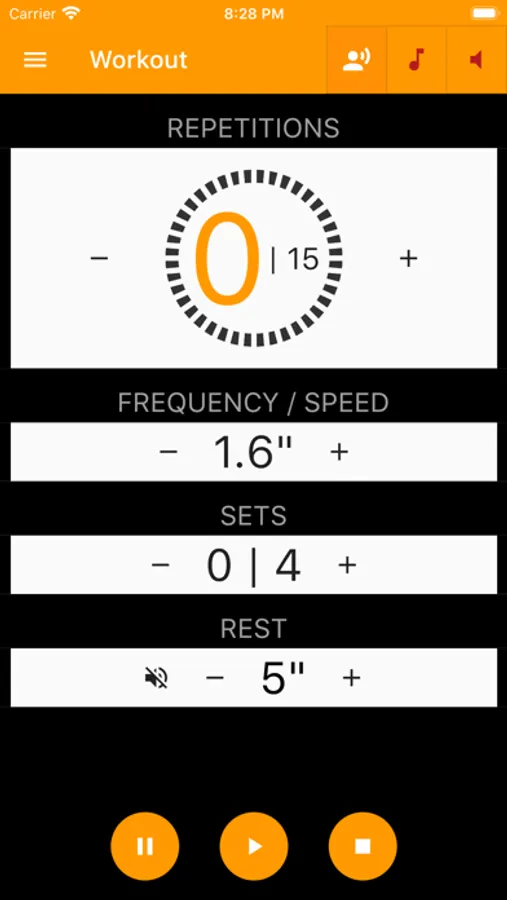 You have the option to set the number of repetitions (up to 99) and their frequency/speed (from 0.2 second to 20 seconds), or the time in seconds you wish to exercise - you can select the mode using the button on the top left; then just set the number of sets (up to 99) and the rest time between sets (from 1 to 99 seconds) by touching the plus or minus buttons. On the top menu, choose how the numbers will be announced: spoken (default), a beep or neither (in case you prefer or need to exercise in silence). Then, on the bottom menu, touch play and get ready to begin!