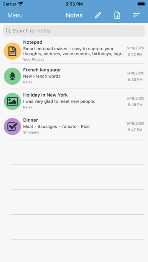 Smart notepad makes it easy to capture your thought, pictures, voice records, checklist, birthdays, logins, and passwords. You can easily organize it and find it quickly later. The notepad helps you to keep all information with you.