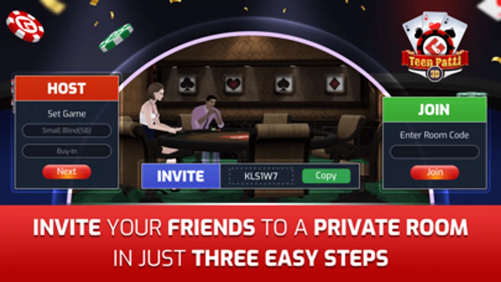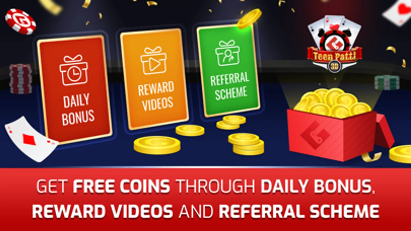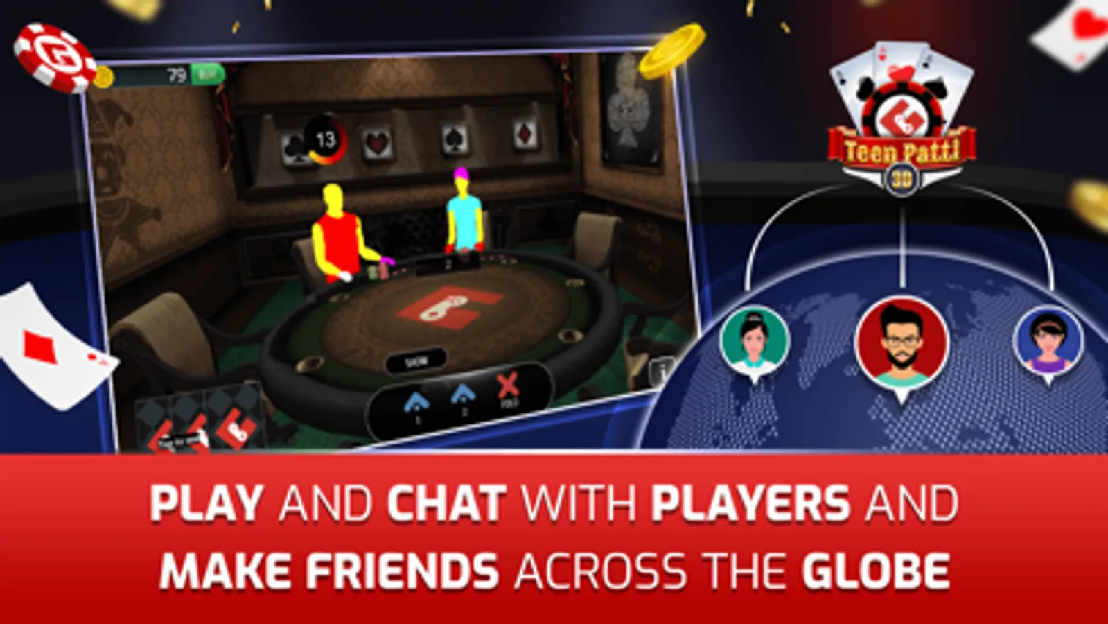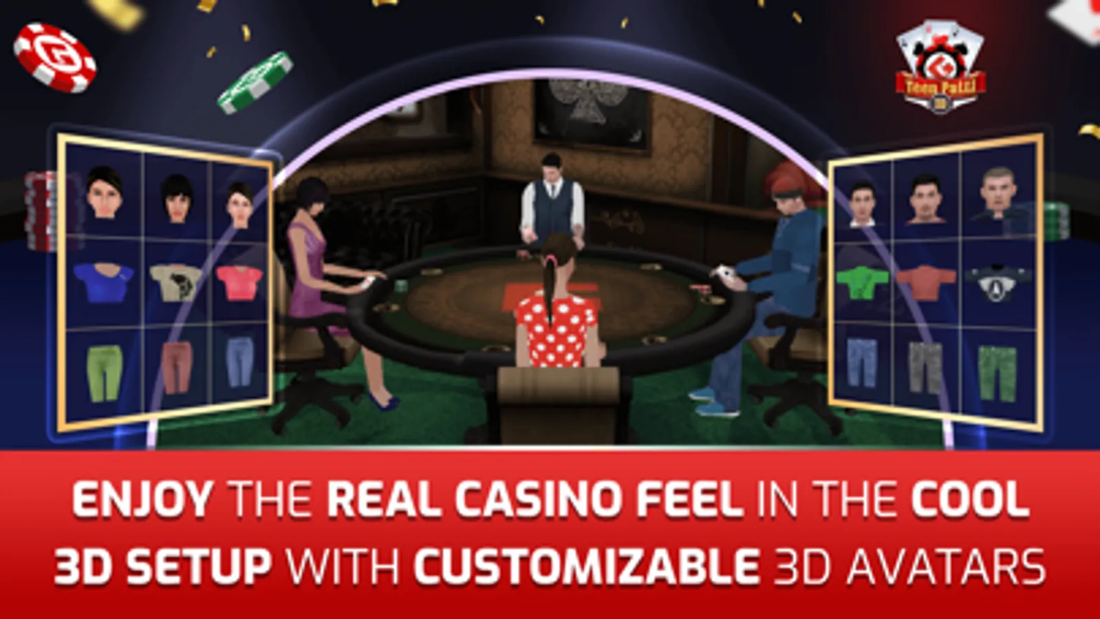 Play the exciting game of Teen Patti for free with millions of players across the globe, that too in 3D.