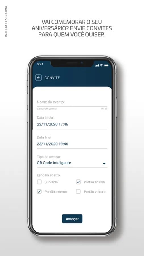 Possibilidade de o morador criar um evento e enviar convites para todos os seus convidados. Sempre que um dos seus convidado entrar ao condomínio, ele recebe uma notificação push no app.