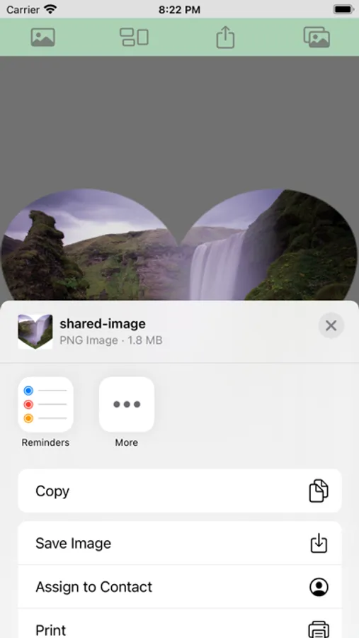 4. Once the shape is properly placed, You can use [Share] to share the shaped photo with other apps or use [Save] to save the shaped photo to the [PicShaper] album.