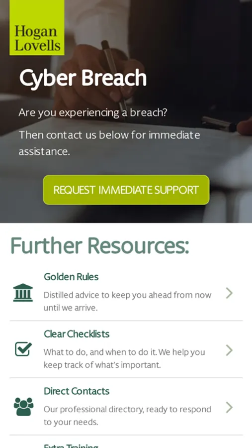 When you get hit by a cyber breach, Hogan Lovells will guide you through the process. Use this app to contact the right lawyers directly, then follow the checklist and observe the golden rules before our team arrives.