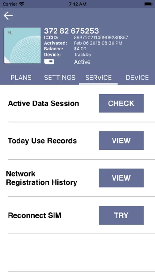 devices, network registration/connectivity status, and the current data and SMS use records. It also