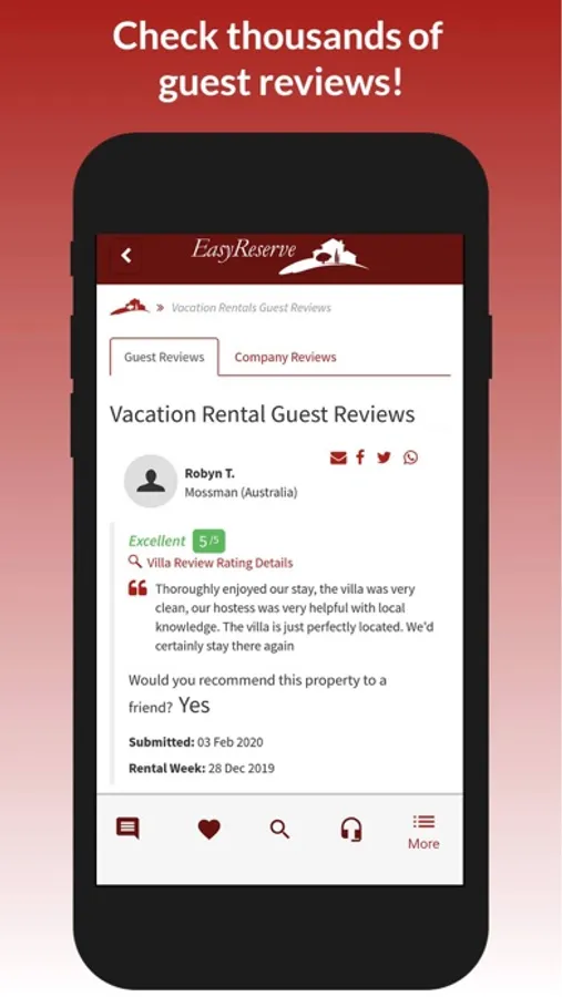 Reviews are one on the most important factors when booking. Thousands of previous Easyreserve clients have uploaded reviews of the holiday villas in which they have stayed - many with their own photos - and these reviews are all available to view in the app.