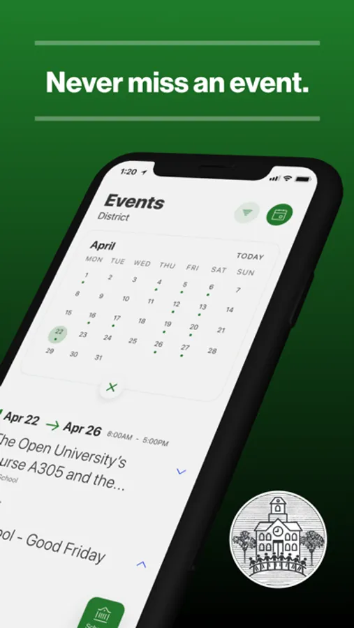 The event section shows a list of events throughout the district. Users can add an event to your calendar to share the event with friends and family with one tap.