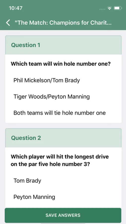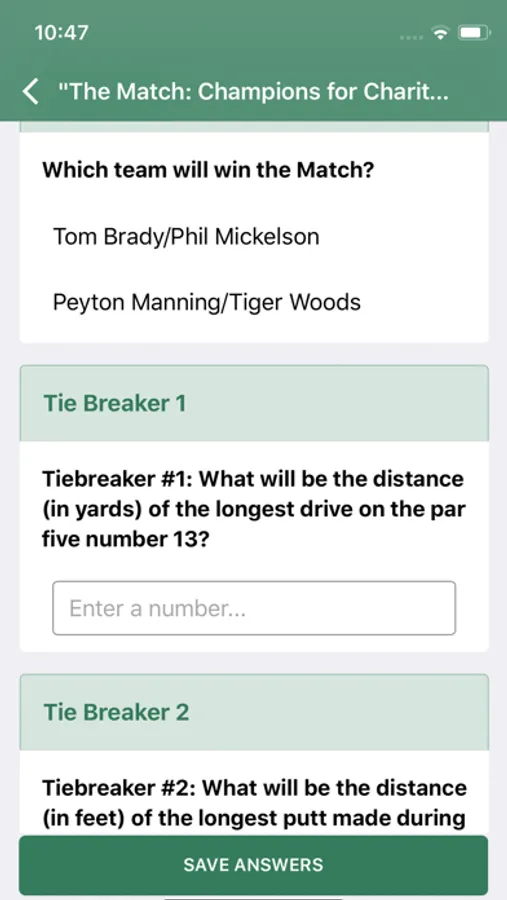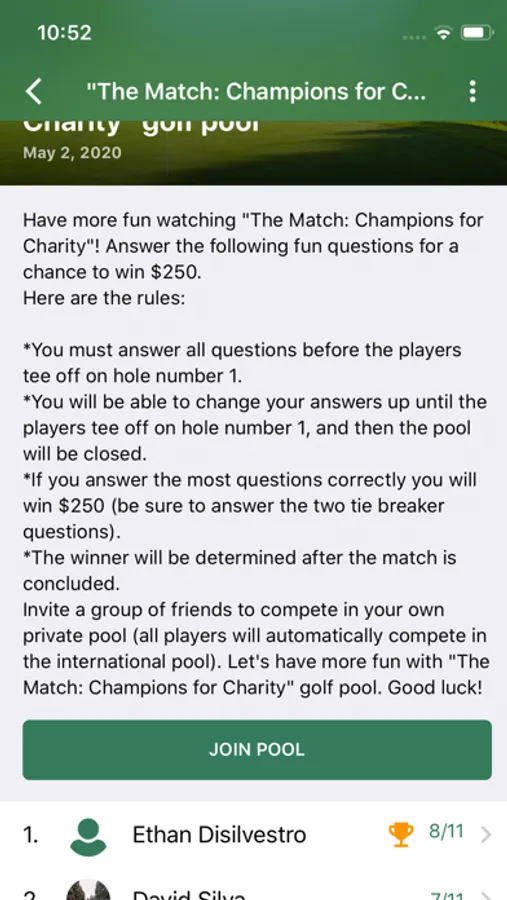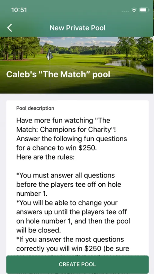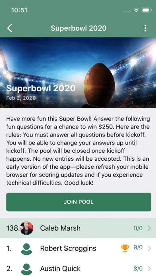 Fun Sports Pools provides a platform for engagement with friends around sporting events. Pools with questions on how public events will unfold are published before events, and users have the opportunity to make their predictions as to how the event will unfold. Users can participate in the public pool for an event, pitting their guesses against a worldwide audience, and in private pools, competing with their friends to most correctly predict events. Tiebreaker questions ensure a single victor, and the winner takes home the virtual trophy and bragging rights!