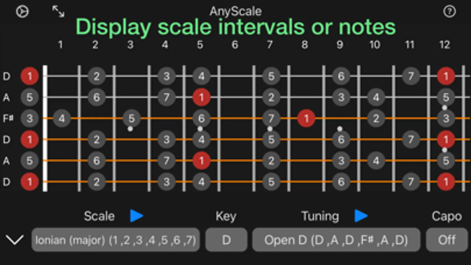 ◦ See your chosen scale displayed on the virtual fretboard.