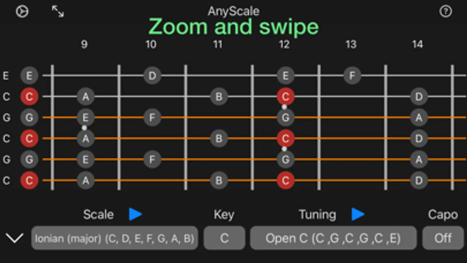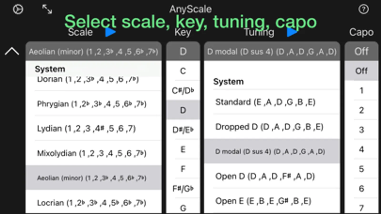 Any Scale is a comprehensive guitar scales and tunings app for anyone looking to get more out of their instrument. Diversify your playing with easy to follow charts, a simple, minimalist aesthetic, audio previews of scales and tunings, and customisable options to allow maximum flexibility.