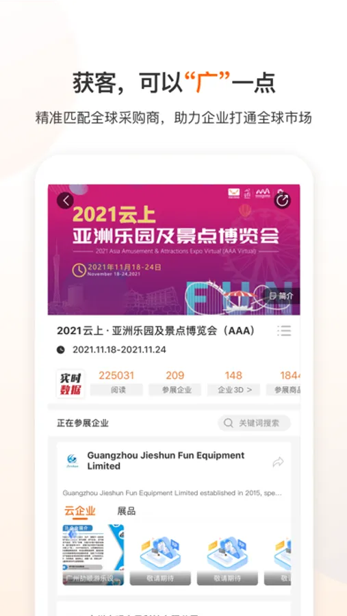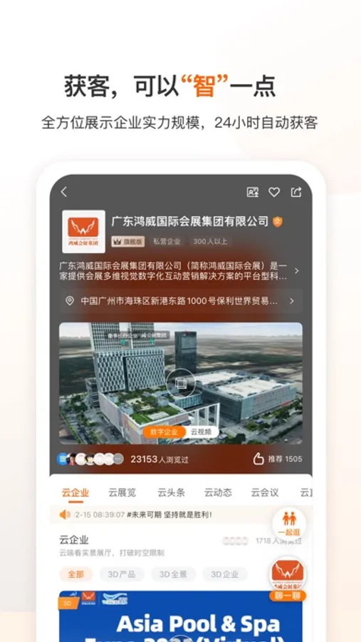 云展动力——全球首家数字孪生精准获客平台,由广州智会云科技发展有限公司历经近10年打磨而成,致力于满足全球企业的数字化贸易需求。借助数字孪生、精准大数据库、人工智能、云计算等核心技术与实体经济深入融合,渗透企业营销全场景,打造智能获客生态,实现获客、留存、转化、客户管理的数字营销闭环,打破时空限制,让全球采购商全天候参观企业,赋能企业数字化贸易升级,降本增效解决获客难题,满足世界贸易需求,让生意变得更便捷、更简单。