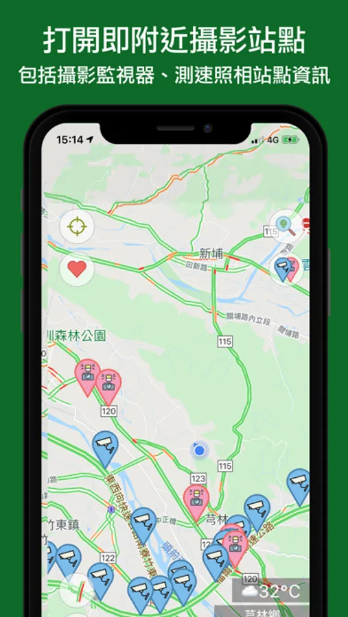 - 打開即用:打開定位即實際地圖上繪製附近即時影像(CCTV),以及測速照相站點資訊。一律呈現最近的五十個站點,變動地圖位置時,再依位置動態更新呈現。