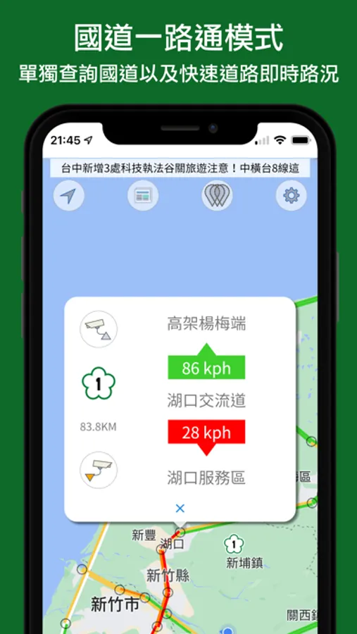 - 國道一路通模式:合併原本「國道一路通」App 服務,此模式可單獨顯示高速公路即時路況(國道即時路況)以及快速道路的路況以及影像。