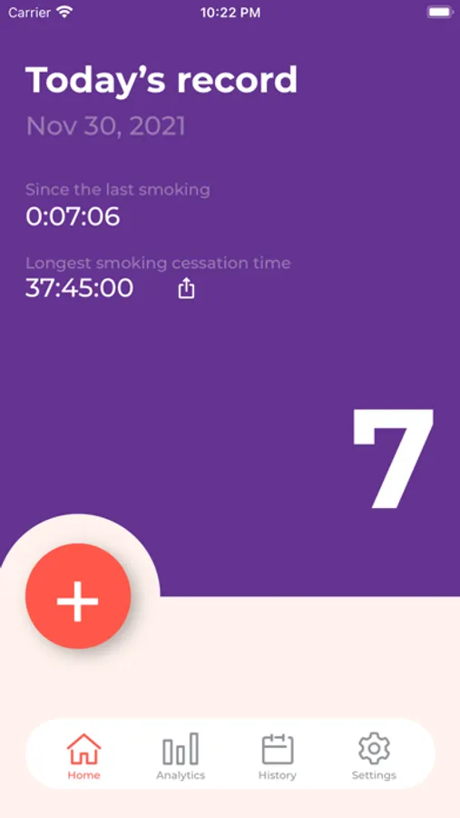By tapping the plus button on the home screen each time you smoke, you can record the number of times you smoked and the start time of smoking today.