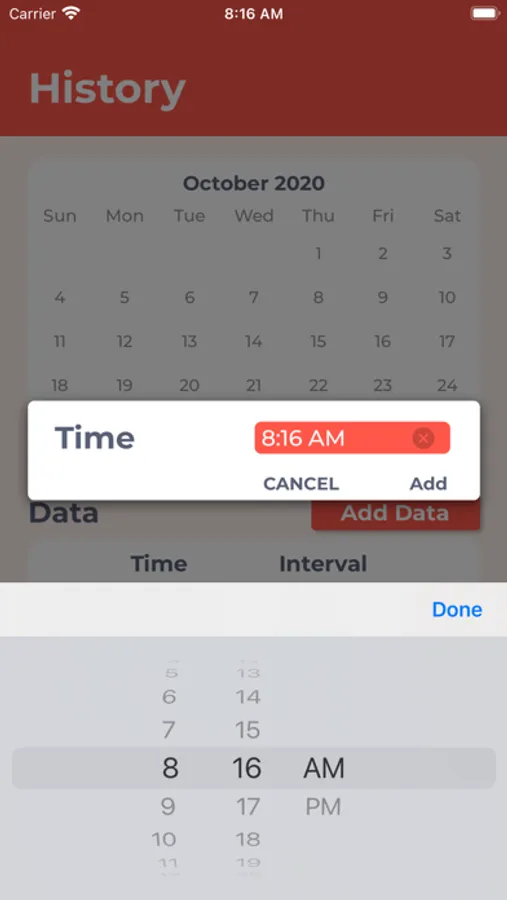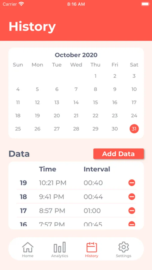The History screen shows a record of smoking times for the date selected in the calendar. To delete the smoking record, tap the delete button at the right end of the data.