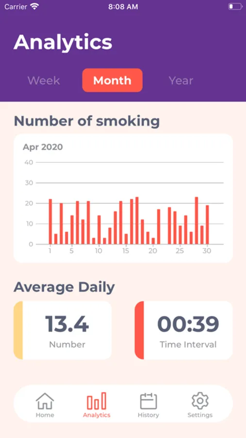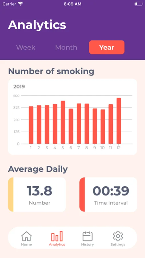 The "Analysis" screen displays a graph of the number of cigarettes smoked each week, month, and year. In addition, the average number of cigarettes smoked per day and the smoking time interval are displayed.