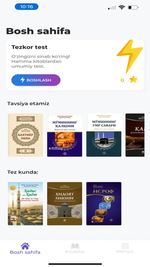 Hilol Test - shayh Muhammad Sodiq Muhammad Yusuf hazratlarining kitoblari asosida tuzilgan savol-javob dasturi bo'lib, unda o'qigan kitoblaringiz asosida o'z bilimingizni sinab ko'rishingiz mumkin
