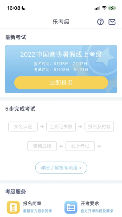 本APP为“中国音协”指定考级APP,可为中国音协考生提供线上报名、付费、考试及获取证书的功能,方便广大考生在线上也能考取音协证书。