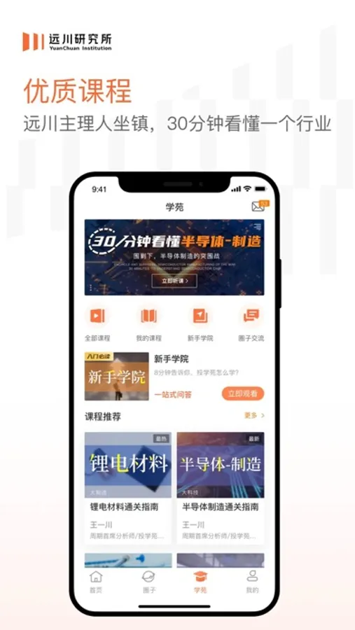 【投资课程】即“远川投学苑”,是一所“投资大学”,提供的是各种静态的、系统的投资课程。通过课程,用户可以30分钟快速弄清楚一个行业,建立最基本的认知框架。