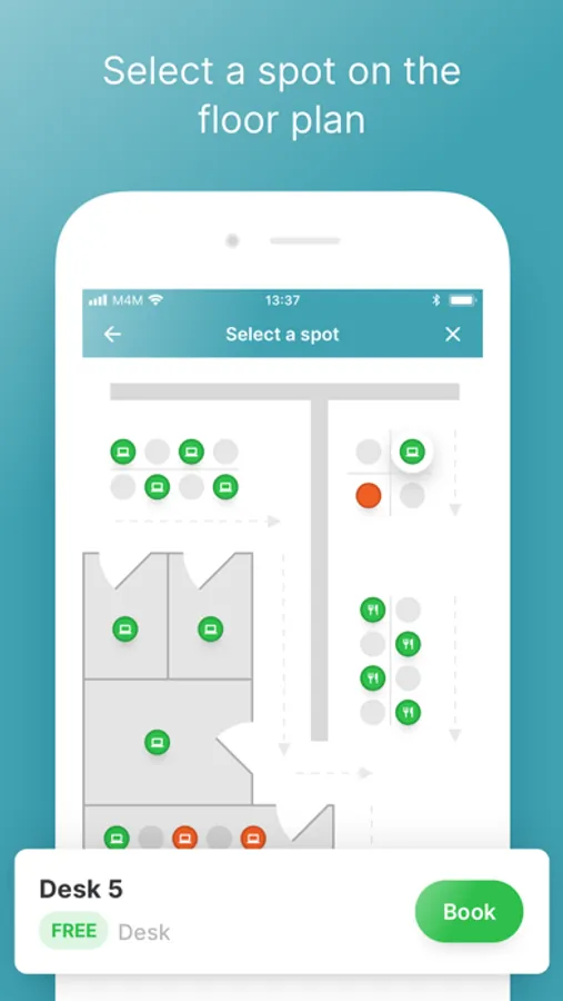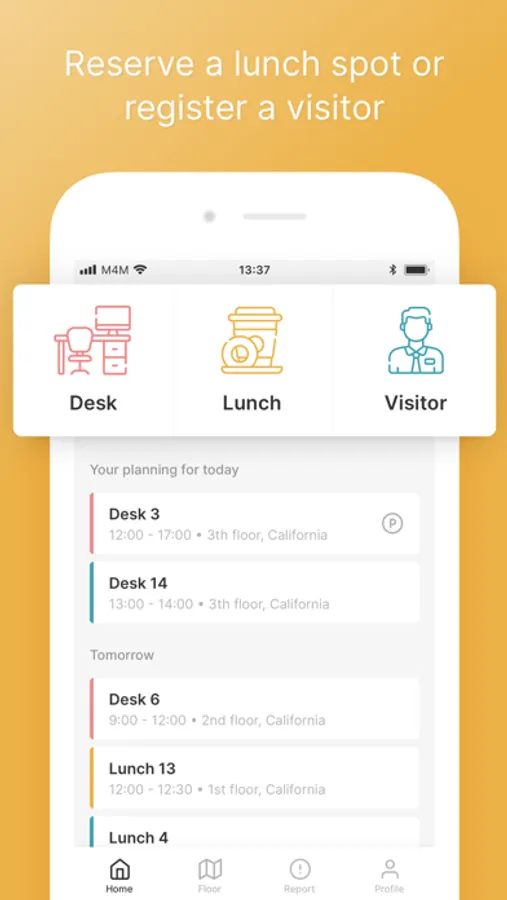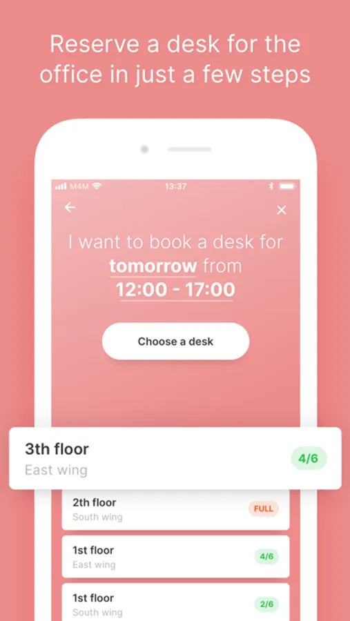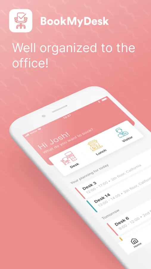 With the BookMyDesk app you can easily and quickly book your desk or lunch spot for the office from home.