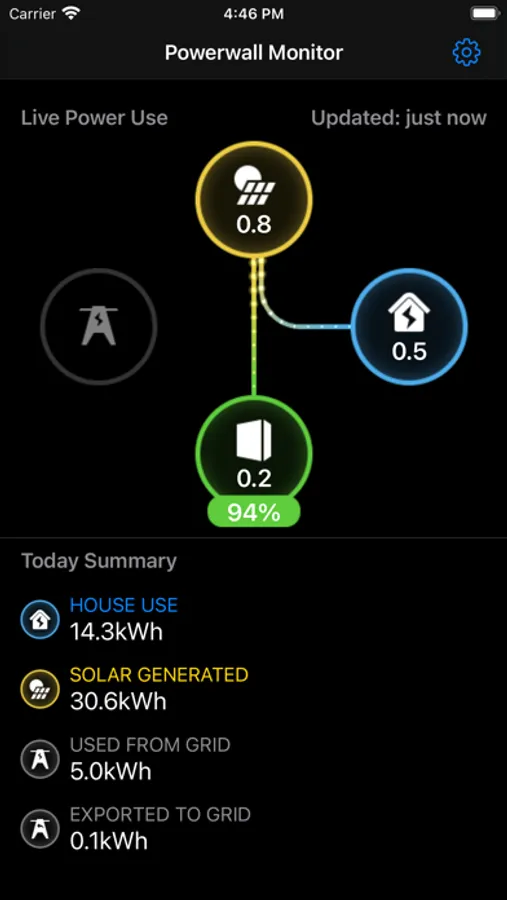 There's two main items in the app, showing live power data as well as a daily summary total telling you how much solar you've generated, home power used and how much grid power you've imported and exported.