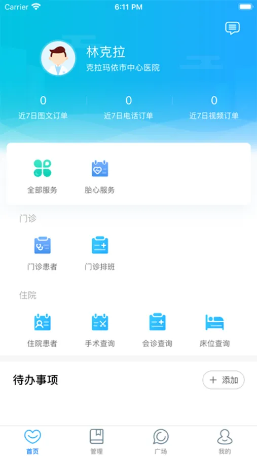 克拉玛依互联网医疗服务平台:为您提供在线复诊(开医技单、开药)在线咨询!报告查询、医嘱查询、床位查询、排班查询等!致力于为医生提供无时间空间限制的医疗管理环境,优化日常工作管理流程,从而提升医疗工作效率。