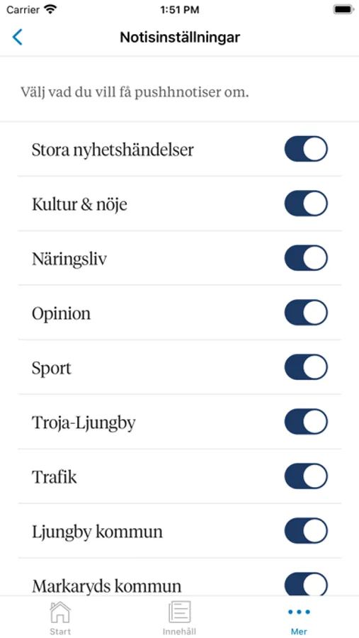 • Välj ett eller flera områden du är intresserad av så får du nyhetsnotiser när något händer i dina områden. Till exempel hemma, på jobbet, i stugan eller vid barnens skola.
