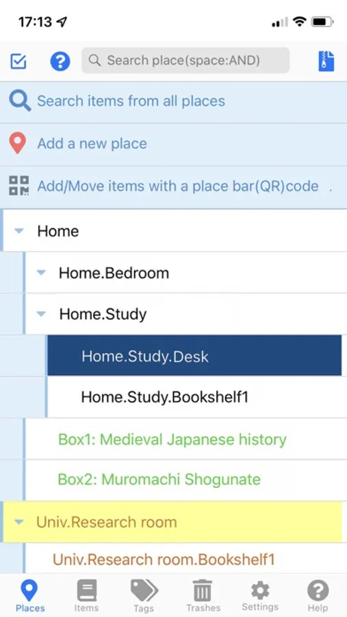 -You can add and name any PLACES, such as "Bookshelf:A", "Box:B" and "Bed room closet". It is not necessary that PLACES are real physical places. They can be "Borrowed by John Doe", "Papers to copy", "Things to survey" and so on.
