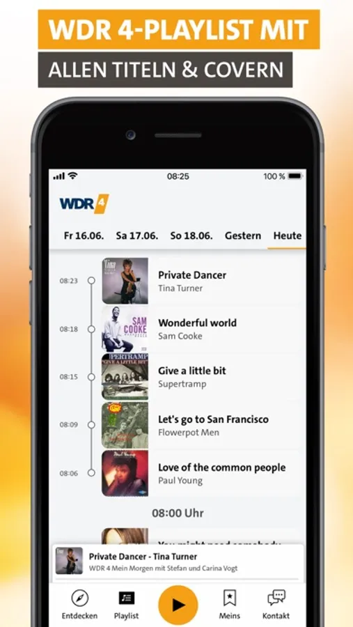In der Playlist können Sie nachsehen, was gerade läuft und welche Titel heute, gestern und in den vergangenen sieben Tagen gespielt wurden – und wie das Cover der Single aussieht!