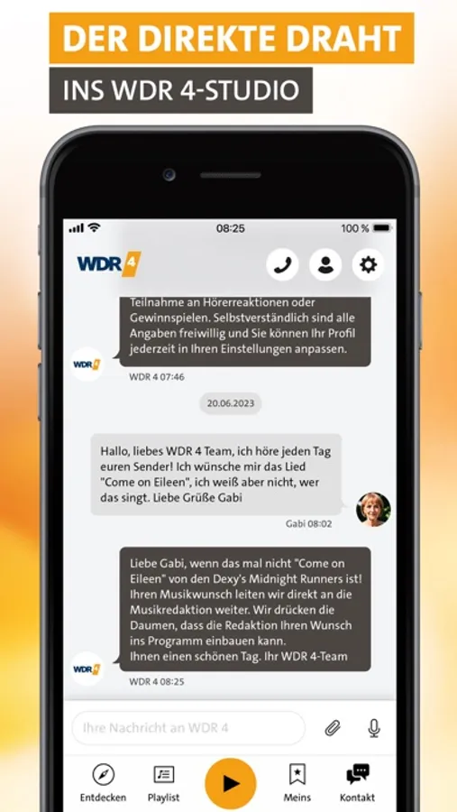 Schicken Sie uns eine Sprachnachricht oder schreiben Sie uns, was Sie bewegt. Teilen Sie uns Ihre Musikwünsche mit oder nehmen Sie an Gewinnspielen teil.