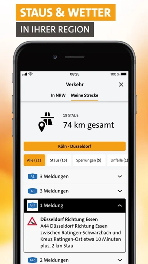 In der App finden Sie immer die aktuelle Ausgabe der Radio-Nachrichten „WDR aktuell“ und natürlich die Infos aus der Verkehrs- und Wetterredaktion. Personalisieren Sie die Meldungen für das Wetter in Ihrer Region oder die Verkehrslage auf Ihrer Strecke.