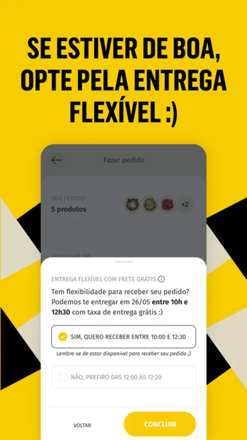 Somente no nosso app você pode programar a entrega do seu pedido, de segunda a sexta, com a Entrega Flexível. Além de te ajudar a organizar as refeições da semana, te garante também frete grátis!