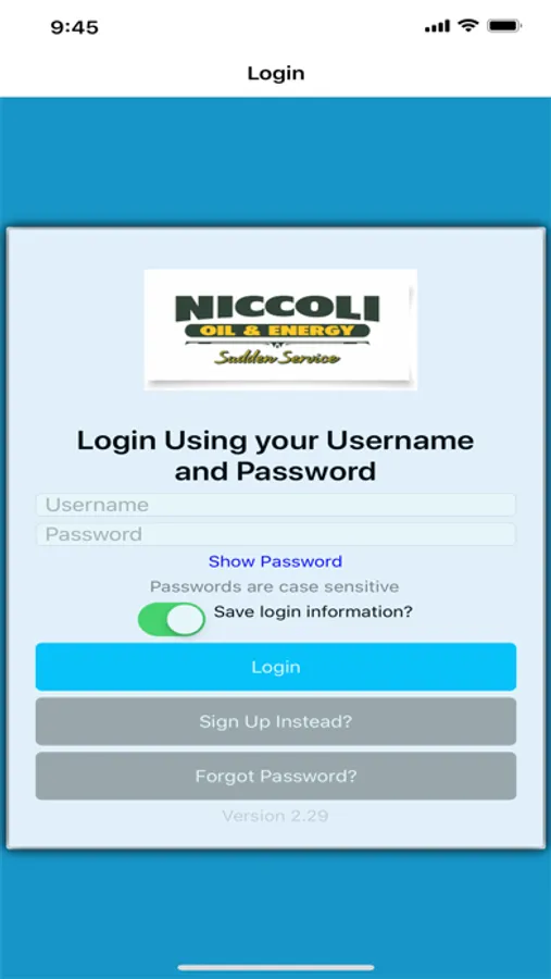 This is the Niccoli Energy app. The app allows users to view information about their account, order fuel, request service, and make payments on their account using their device. Customers create a login for this app by using an account number that they obtain from registering on our website. There is no cost or fees to register and use this app.