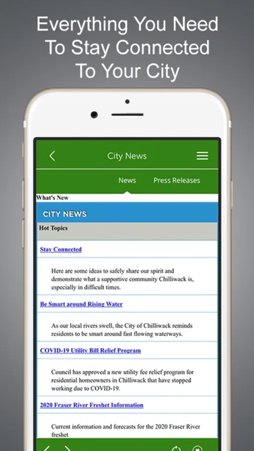 With features like City Hall, Contact Information, City News, and Report an Issue you'll find it easier than ever to stay connected with the City of Chilliwack with just a few taps on your mobile device.