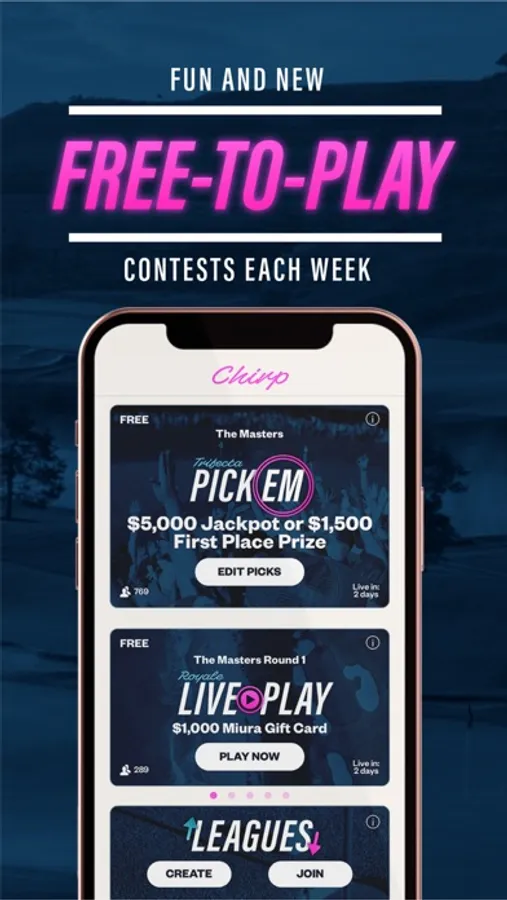 Chirp Golf is your home for the best of real money Daily Fantasy Sports (DFS) and Free-To-Play games. Featuring simple to play, easy to learn, and fun games, Chirp Golf has something for every golf fan.