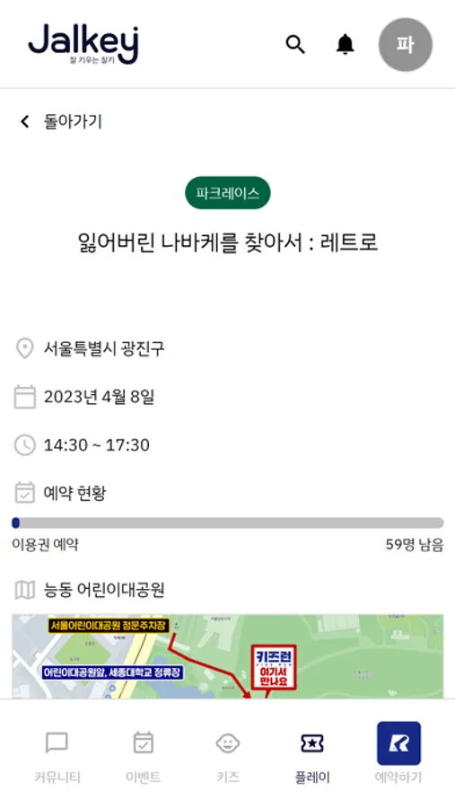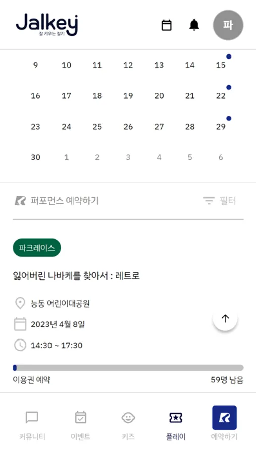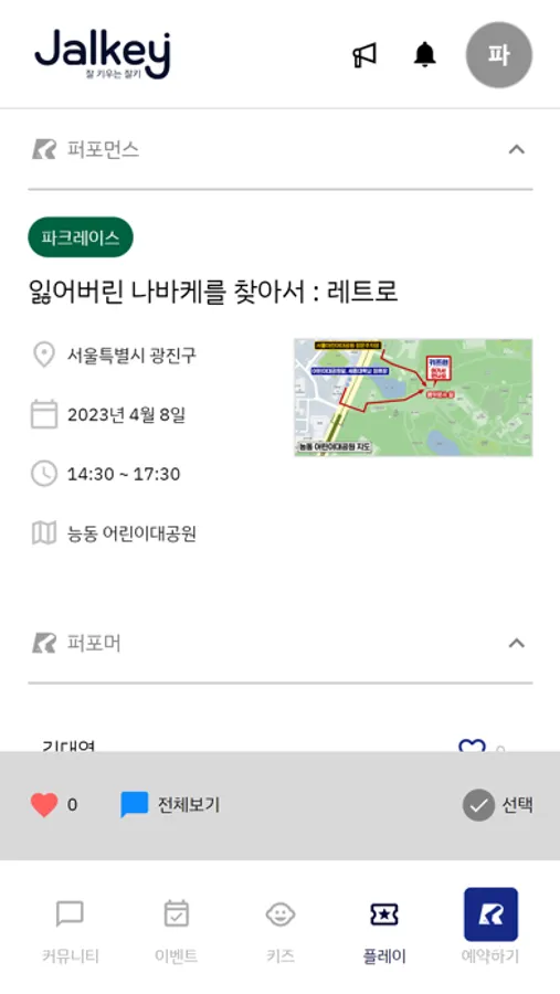 플레이 탭에서 진행 예정 퍼포먼스 정보를 확인하고 예약하세요