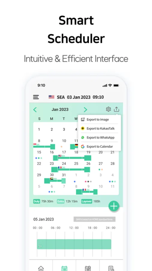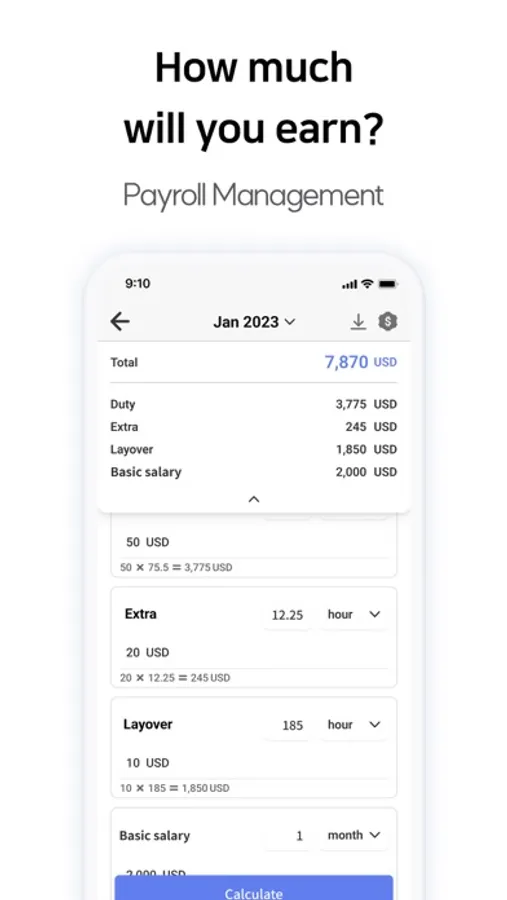 ▶ Payroll calculator : You can check the estimated salary based on Duty, Extra, Layover hours. The allowance for the flight is saved after you enter only the first time.