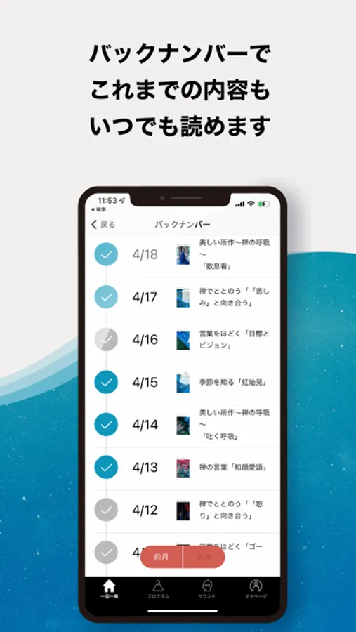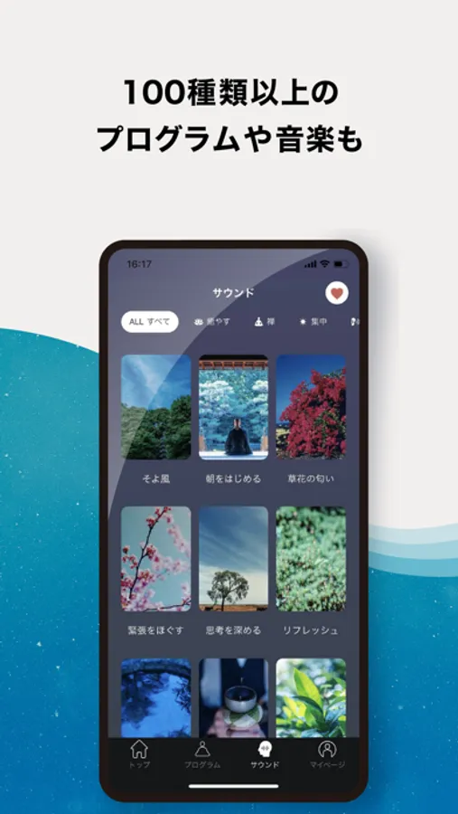 また、このほかにも不安やストレスを感じた時、心を落ち着かせたい時、なかなか眠れない時、などの目的ごとにカスタマイズされた100を超えるプログラムや、癒す / 禅 / 集中 / ながら聞き / 自然の音の5つのカテゴリーからそれぞれのシーンにあった瞑想音楽を楽しめるサウンドメディテーションもご用意しております。
