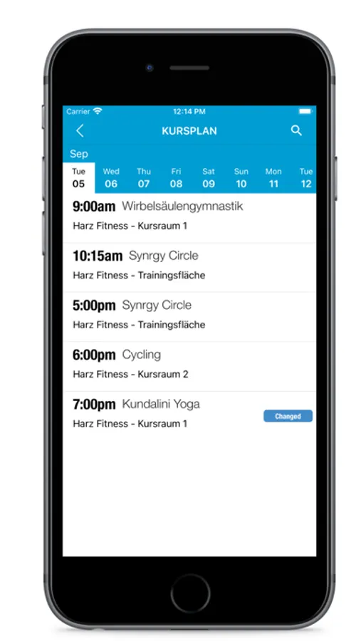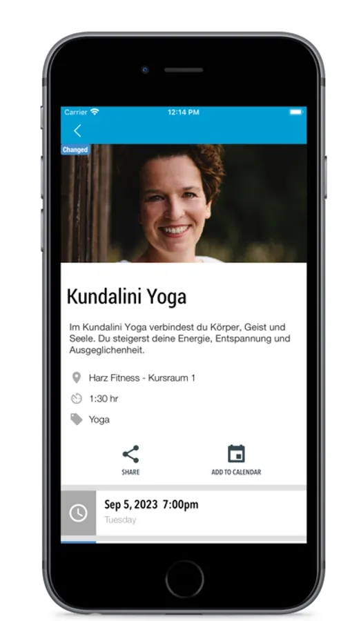 Direkter und aktueller Zugriff auf den Kursplan von überall: Für jeden Kurs kannst Du Details wie Zeit, Kursbeschreibung, Raum und Merkmale wie z.B. den Schwierigkeitsgrad einsehen.
