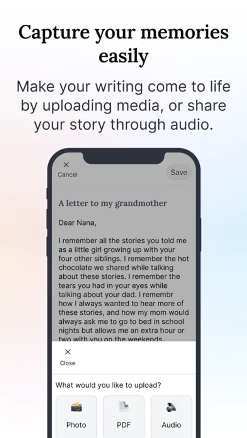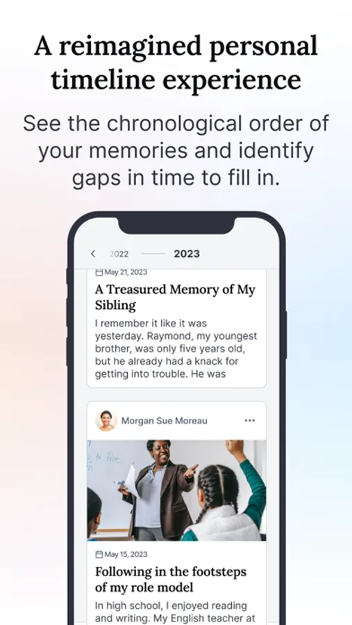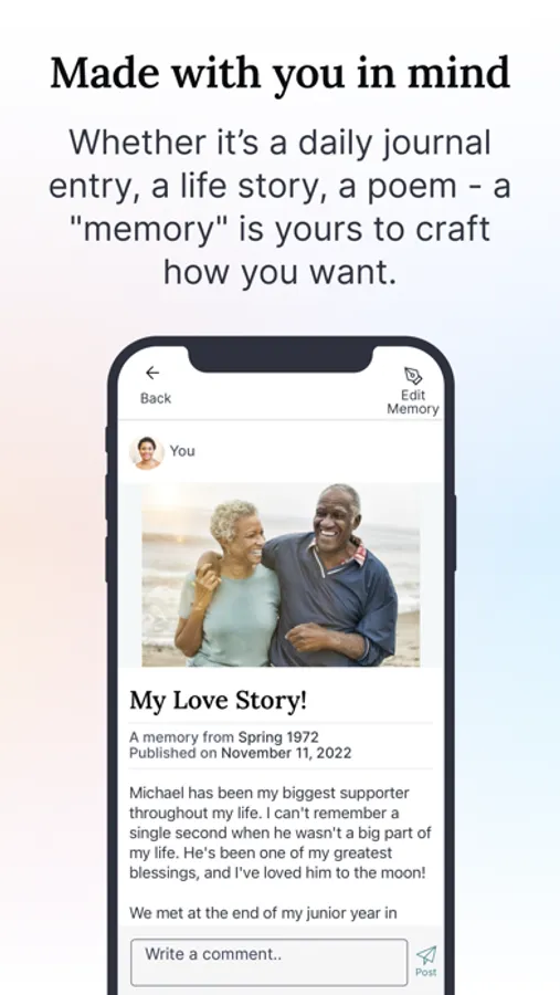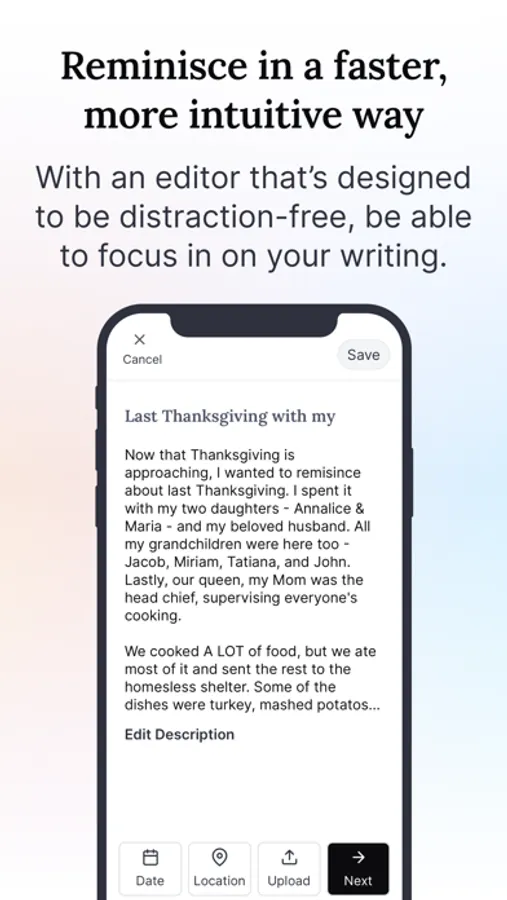 Built in consultation with psychology professors, we leverage the latest academic research on reminiscing, nostalgia, and memory recall to help you remember and record memories to enrich your life as well as the lives of your loved ones.