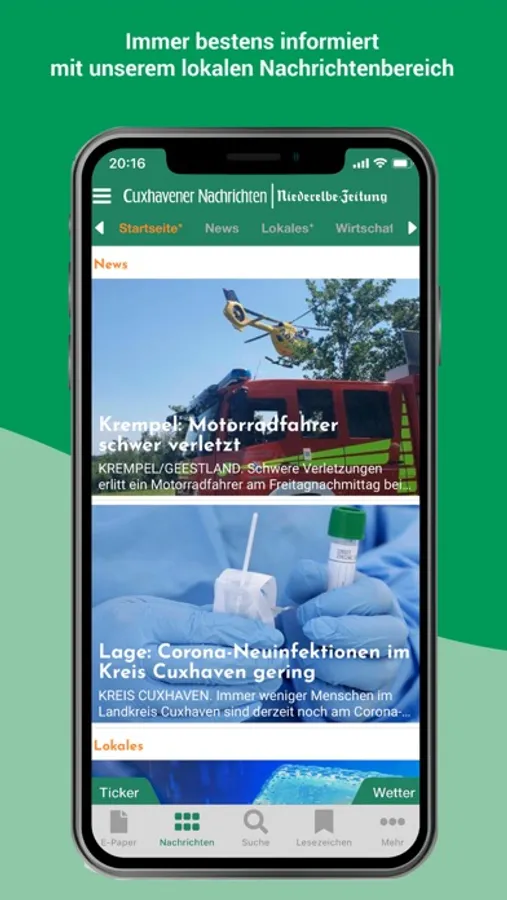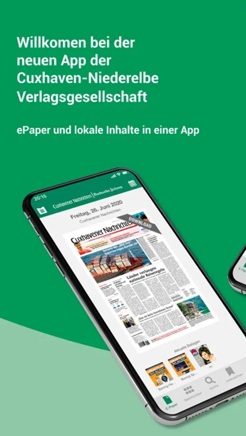 Mit der ePaper-/Newsapp der Cuxhaven-Niederelbe-Verlagsgesellschaft sind Sie täglich rundum informiert. Aktuelle Nachrichten aus der Elbe-Weser-Region, lokale Sport- und Kulturereignisse lesen Sie bequem und einfach auf Ihrem Smartphone, Tablet – wann und wo immer Sie mögen, natürlich auch offline.
