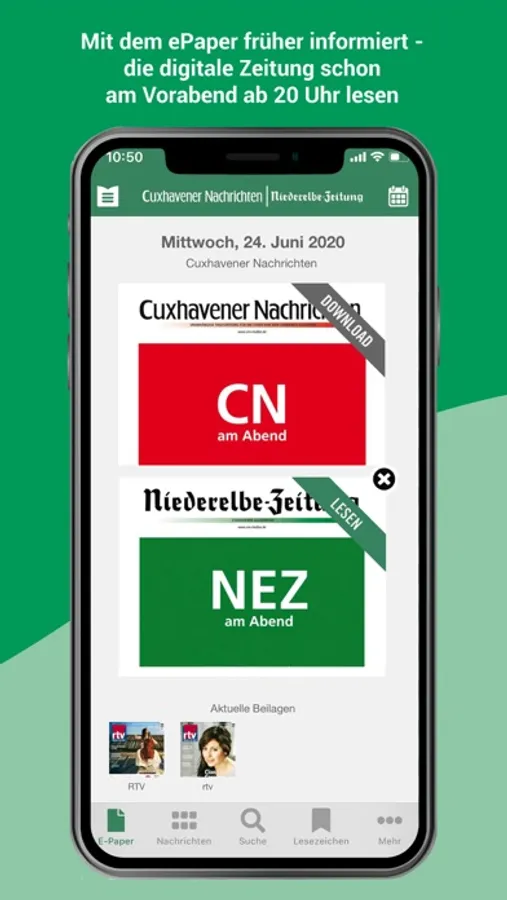 Mit dem ePaper der Cuxhaven-Niederelbe-Verlagsgesellschaft erhalten Sie die aktuellen Ausgaben der Cuxhavener Nachrichten und der Niederelbe-Zeitung in digitaler Form. Bereits am Vorabend ab 20.00 stehen Ihnen ausgewählte Seiten zur Verfügung. Ab ca. 2:00 Uhr steht dann die komplette Ausgabe der Cuxhavener Nachrichten bzw. der Niederelbe-Zeitung des nächsten Tages zum Download bereit.