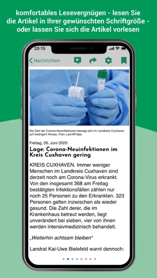 Lesen Sie alle Artikel in Ihrer bevorzugten Schriftgröße. Öffnen Sie dazu einen Artikel und ändern Sie dort per Schieberegler nach Bedarf die Schriftgröße oder Sie nutzen die Vorlesefunktion und lassen sich die Artikel einfach vorlesen.