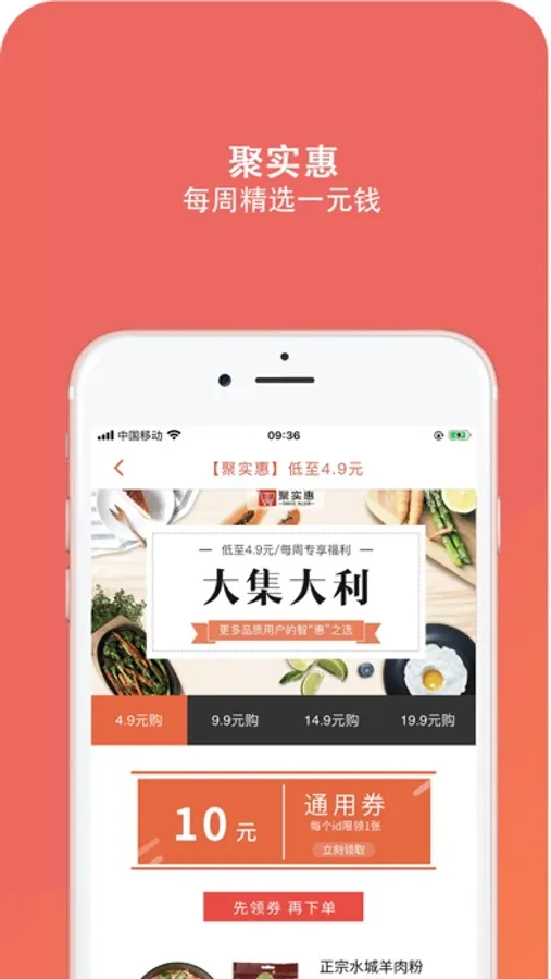① 劲爆促销:聚实惠低至9.9、APP专享折扣、优惠券、限时满减等,优惠多多