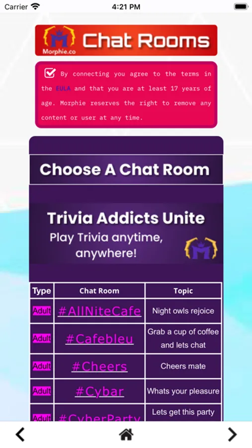 Chat as a guest or pick a nickname. Chat rooms are hosted by the Morphie IRC Network.
