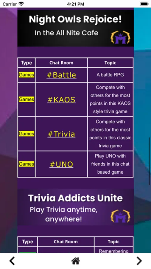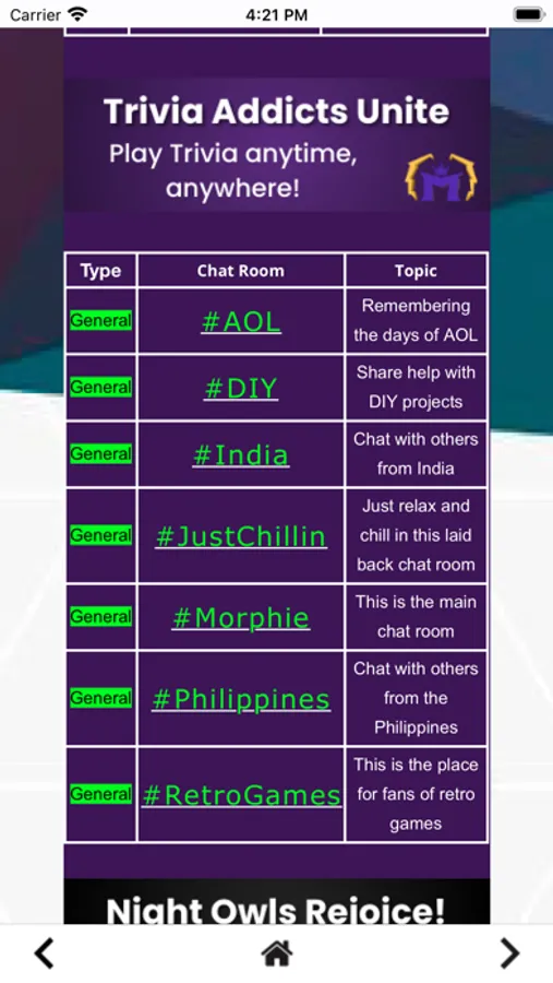 Chat anonymously with others in a 90s style chat room environment! These easy to use chat rooms let you connect with others from around the world in a safe environment. You can also play chat based games and compete for daily, weekly and monthly high scores that are saved and displayed regularly. You will also receive special status for earning a spot in the high scores for certain games.
