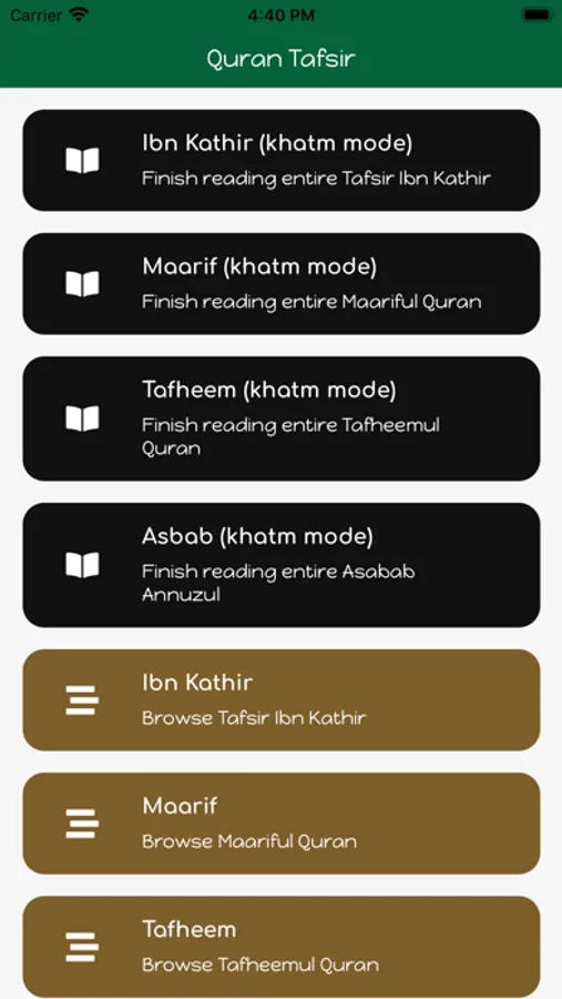 The app features four major tafsirs: