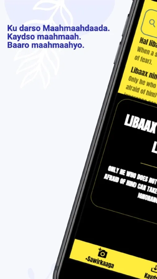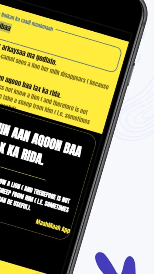 Kani waa APP xiiso leh oo daboolaya maahmaahyada Soomaaliyeed. Waxaa ku jira 100s oo maahmaah Soomaaliyeed ah oo aad la xiriiri karto nolol maalmeedka. Dadka soomaliyeed waxay caan ku yihiin majaajillo iyo firfircoonaan laakiin maahmaahda runta ah.