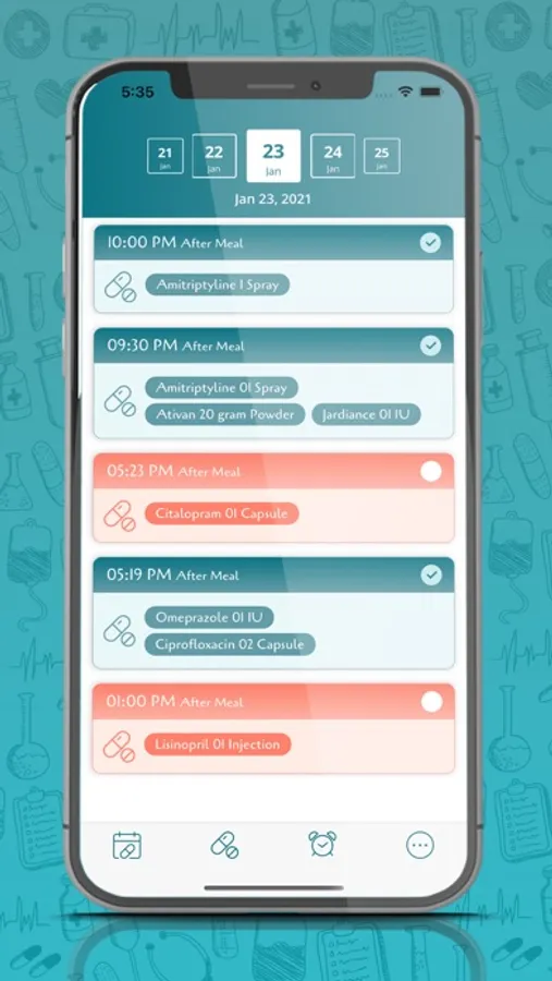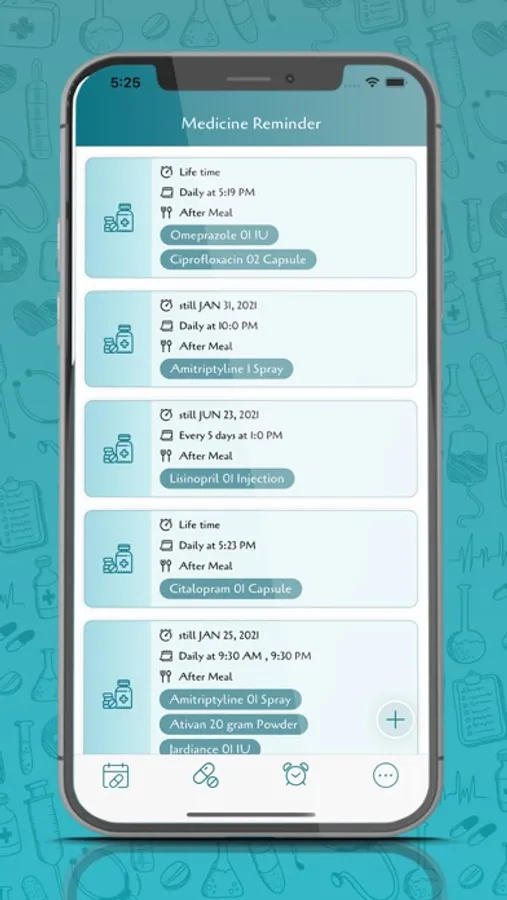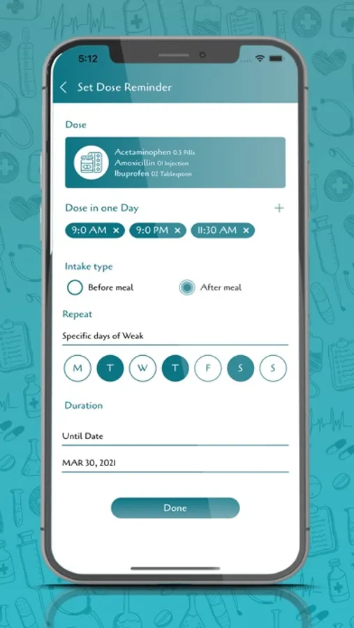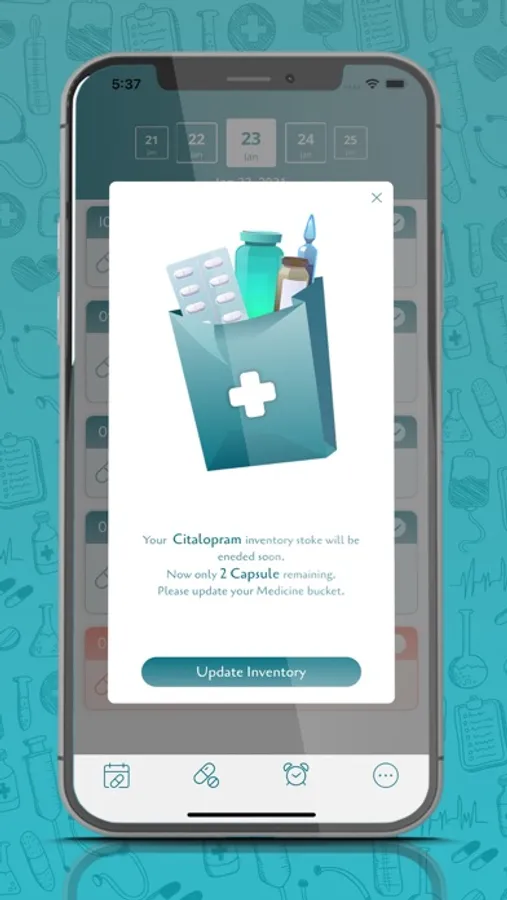 Set the drug name, dosage information, directions, and notes that appear in the reminders for each dose. You can also track each drug's stoke end date. and also create inventory reminder.